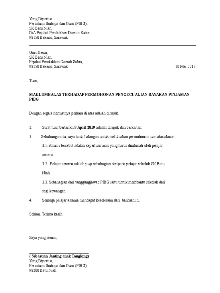 Surat Maklumbalas Permohonan Pengecualian Bayaran Pinjaman Pdf